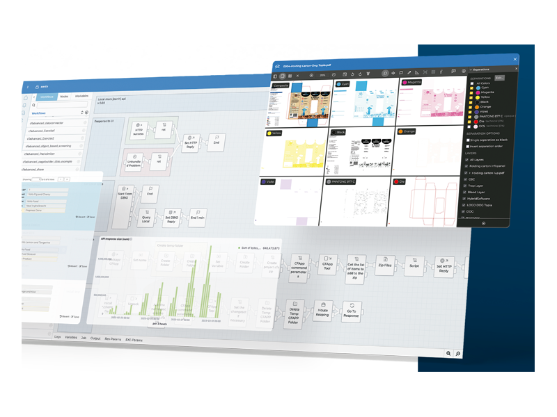 Integrado a outras soluções da Hybrid Software, como o PackZ, ele otimiza processos de provas digitais (com o Proofscope) e permite criar um fluxo de gerenciamento de cores assertivo com o Colorspace.